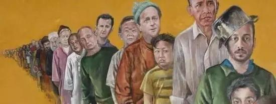叙利亚艺术家Omari最近展示出了一系列的肖像画,他将一些有争议的世界领导人画成了被剥夺权利或流离失所的平民,这一系列的作品一经发布,就在全球范围内掀起热议的波澜。