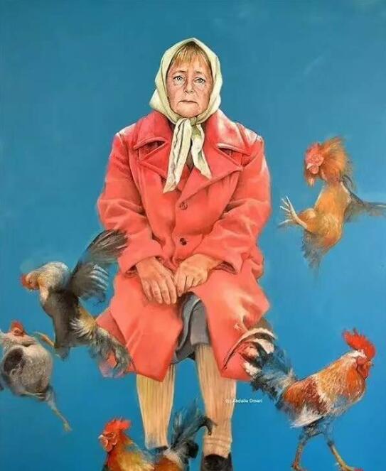 默克尔围着头巾,穿着朴素,一群鸡围绕身旁,俨然成了乡村大妈。
