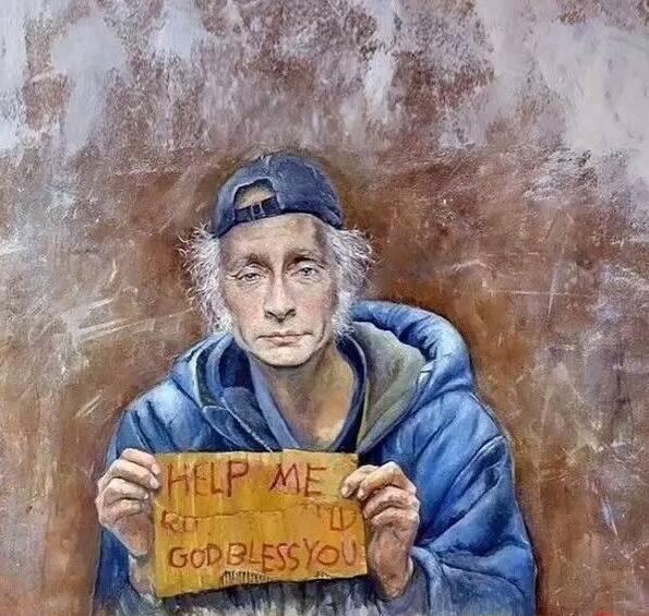 普京成了双鬓斑白的“乞丐”,手拿一张拼凑起来的废纸,写着:帮帮我,上帝保佑你。