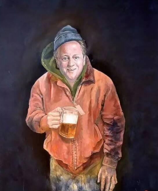 一脸傻笑的英国前首相卡梅伦,手里握着半杯扎啤,活脱脱一街头混日子的大叔。