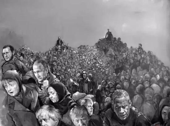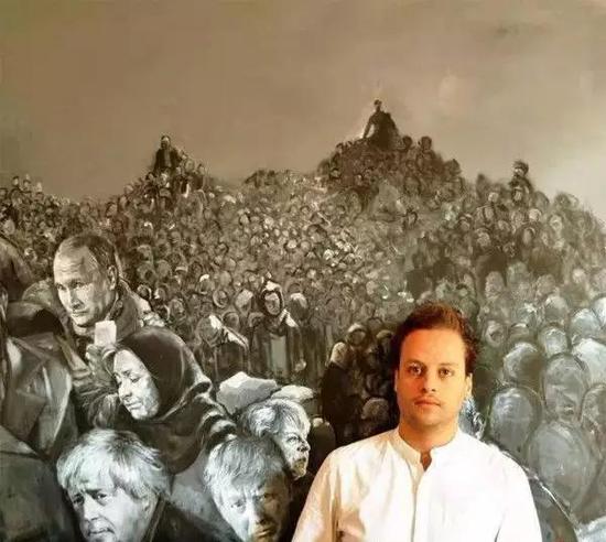 上图就是叙利亚艺术家阿卜杜拉·奥·奥马里本人,背景图为各国领导人簇拥在被各国驱逐的边境线上。