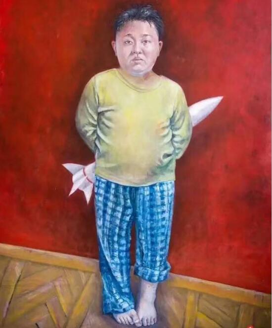 朝鲜最高领导人金正恩,怯兮兮地把玩具藏在身后,那一高一低的裤管俨然一个落魄的小胖孩子。