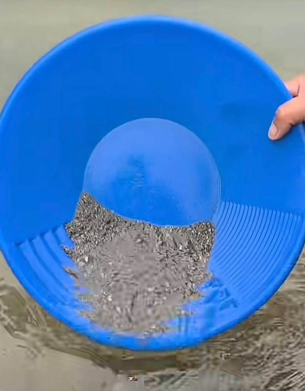 在李正川看来,淘金的难点不在技法,而在找到“有金的地方”,这全凭经验和探测器。他的淘金方式与郭成福不同,不是去铲河床的泥沙,而是“扣缝”,即河底或河岸那些长期被水流冲刷的细小缝隙里往往藏着砂金,把缝里的泥沙刨出来,再一盆一盆清洗。